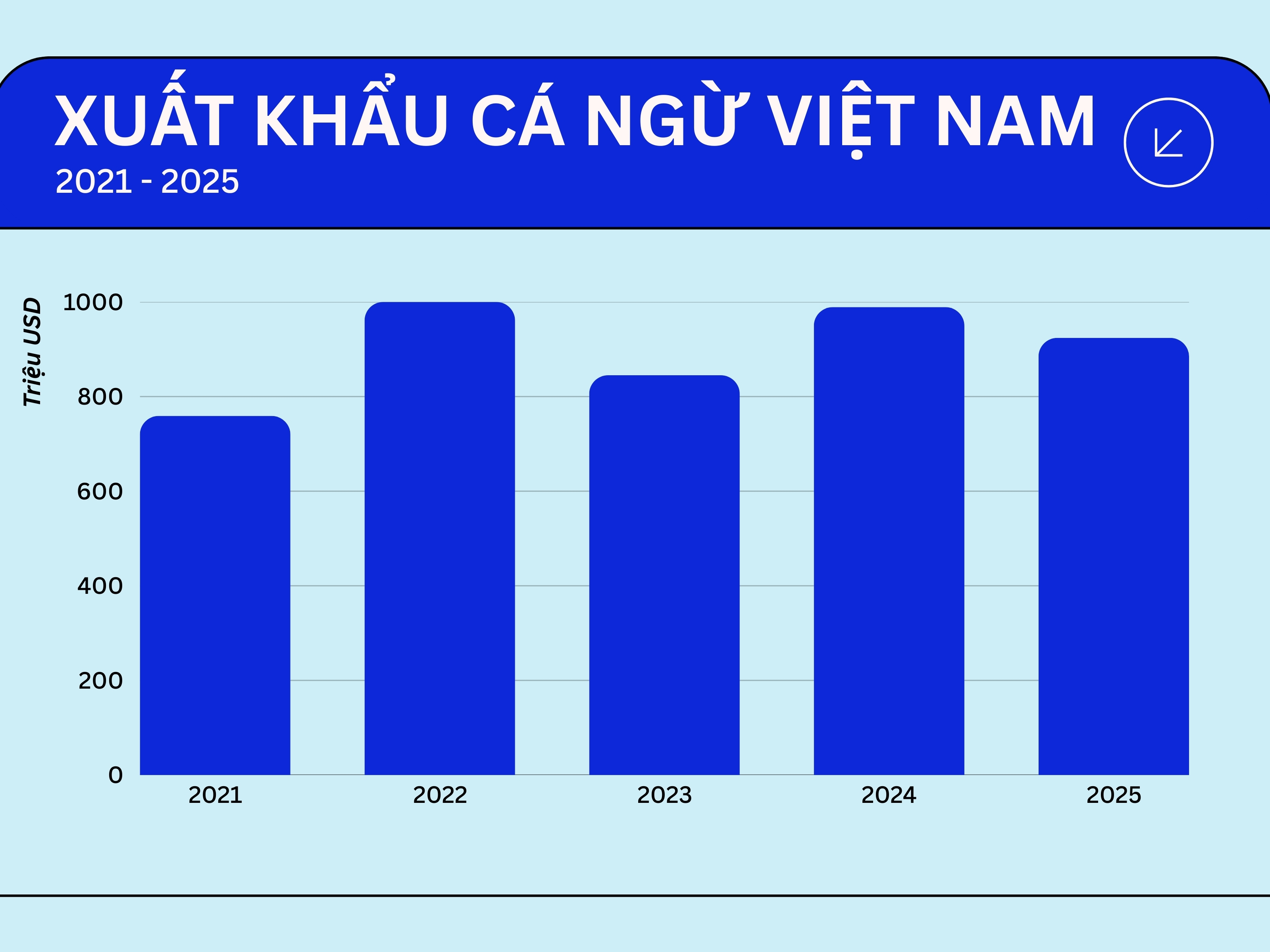Trong 5 năm (2021 – 2025), XK cá ngừ của Việt Nam đã tăng 22% từ 759 triệu USD năm 2021 lên 924 triệu USD năm 2025. Giá trị XK cá ngừ của Việt Nam trong giai đoạn này tăng trưởng trung bình đạt 14%/năm. Các loài cá ngừ XK chủ yếu của Việt Nam gồm cá ngừ vây vàng, cá ngừ mắt to, cá ngừ vằn…